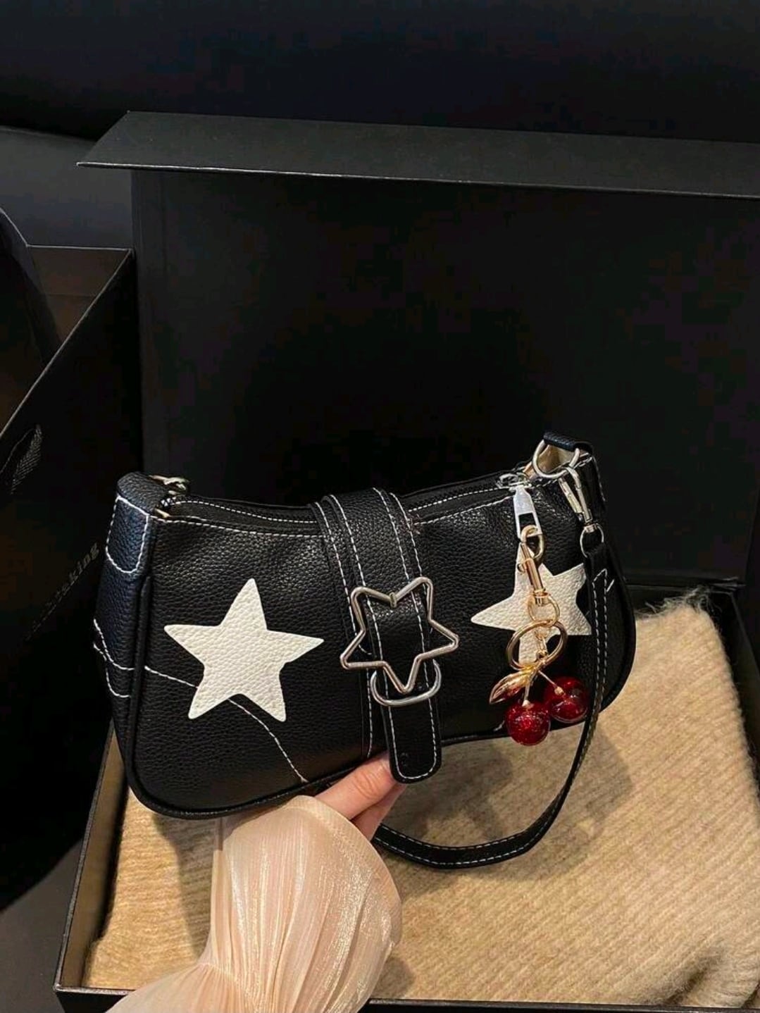 星柄スタッズ&チェリーチャーム付♪ Y2Kスターショルダーバッブラック