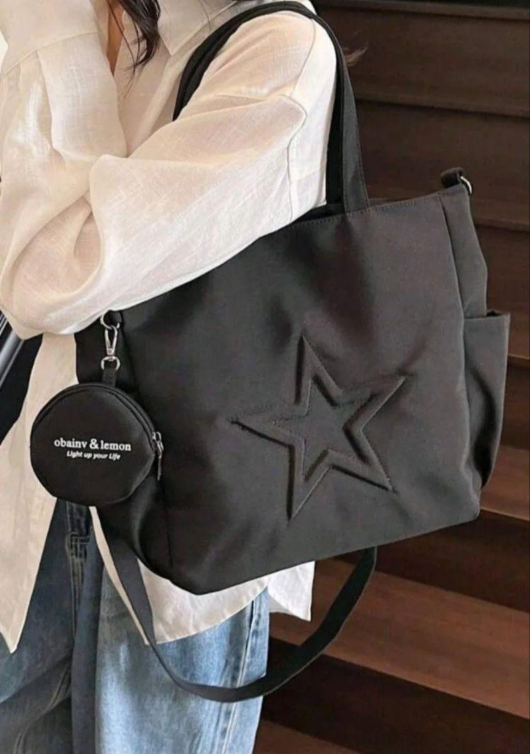 ワンポイントの星モチーフが目を引く、シンプルで使いやすい2wayトートバッグ。
